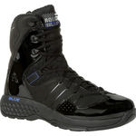 With a modern design, innovative technologies, construction, and brand name you can trust. You can't go wrong with The Rocky® Code Blue collection. This 8-inch soft toe public service shoe is constructed with a nubuck upper with TPU overlays along with a matte finish black for a stylish look. The 6 mm oval laces give you a secure fit; a side zipper that makes it possible to get these boots on/off easily. A soft comfort collar lining and a breathable mesh tongue snug around ankles. Cement construction makes this Rocky boot light and flexible, and an oil- and slip-resisting rubber outsole with a wider stance allows you perform in many environments without hesitation. Experience comfort in every step with our patented Comfort Tracks footbed. This combined with our Rocky Rebound EVA midsole and a fiberglass shank for added stability allows you to confidently go about your day in comfort. This shoe also features a KulKote® thermal regulating lining, which helps regulate your body temperature providing a more comfortable experience. If you need an 8-inch black lightweight shoe with an athletic feel and a comfortable, supportive construction, choose the Rocky® Code Blue collection.